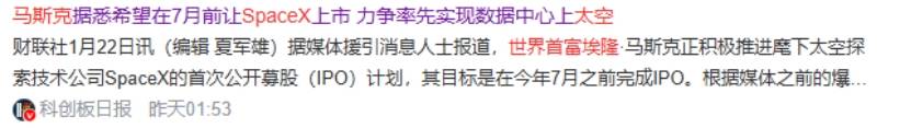 1月22日,据媒体援引消息人士报道,世界首富埃隆·马斯克正积极推进麾下太空探索技术公司SpaceX的首次公开募股(IPO)计划,其目标是在今年7月之前完成IPO。