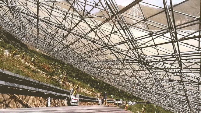 首先,用一个固定的抛物面作为反射面肯定是不行的。那直接采用阿雷西博望远镜的方案行不行呢?也不行。有两个原因:一是阿雷西博望远镜观测天区比较小,仅能观测天顶距20度以内的范围;二是阿雷西博望远镜的馈源平台重量达到900吨。按这个方案做一个口径更大、观测范围更广的望远镜,馈源支撑平台会更重,难以悬吊在高空中。