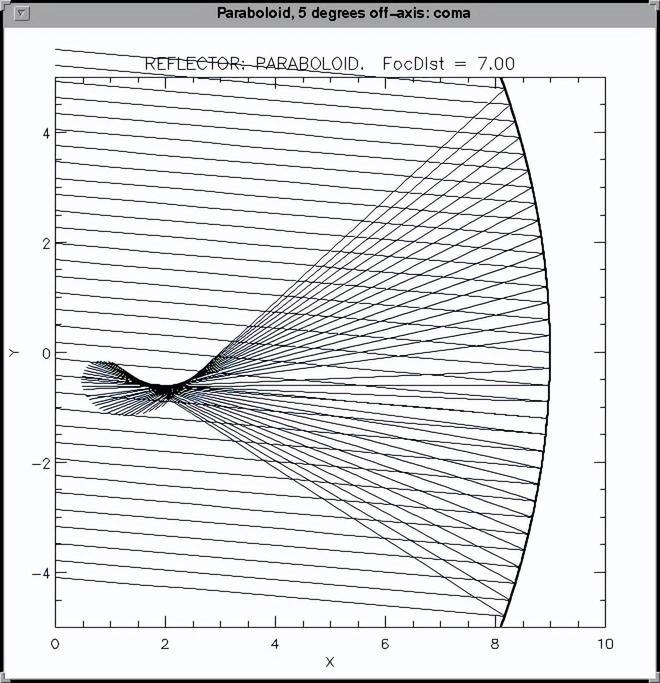 上图:平行光线沿光轴(对称轴)入射,经抛物面反射汇聚到焦点。下图:平行光线度角入射,经抛物面反射后无法汇聚到一点,形成“彗差”。